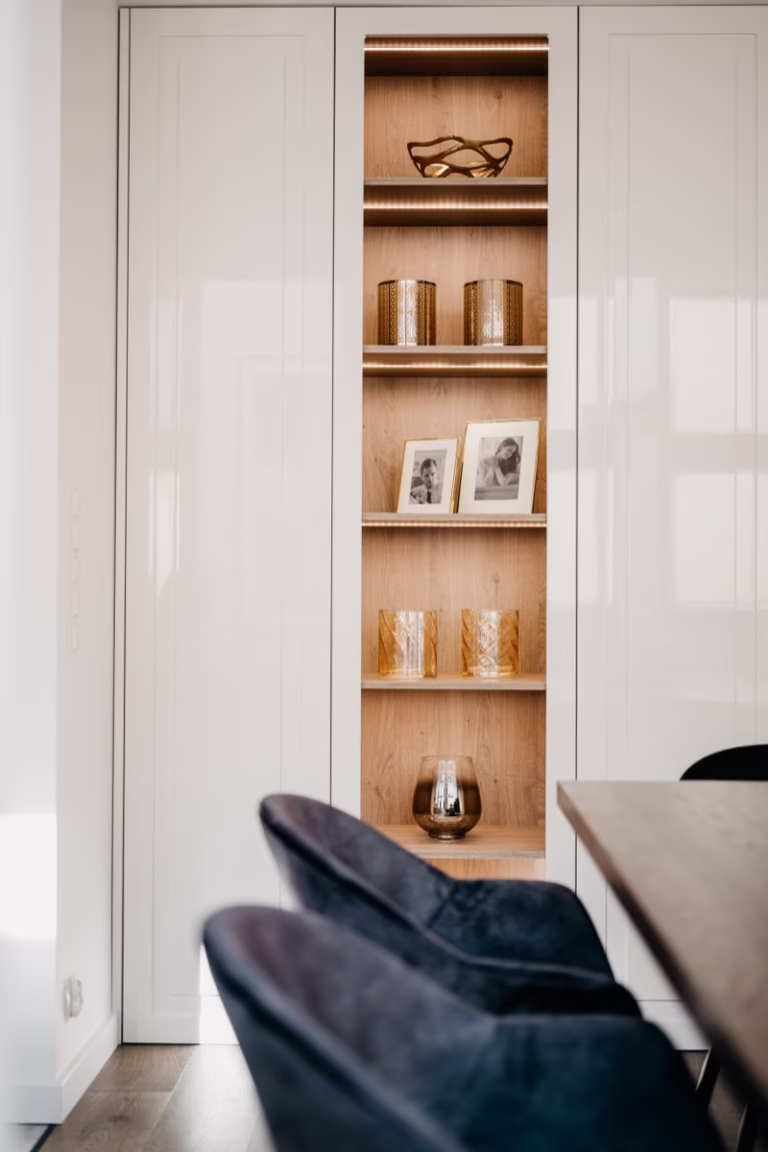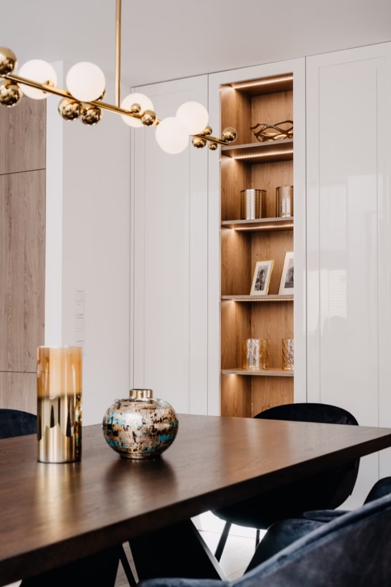W jadalni warto zwrócić uwagę na piękny, drewniany stół na metalowej nodze. Uwagę również przykuwa regał z dekoracyjnym oświetleniem oraz frezowane, w pełnym połysku fronty sąsiedniej zabudowy.