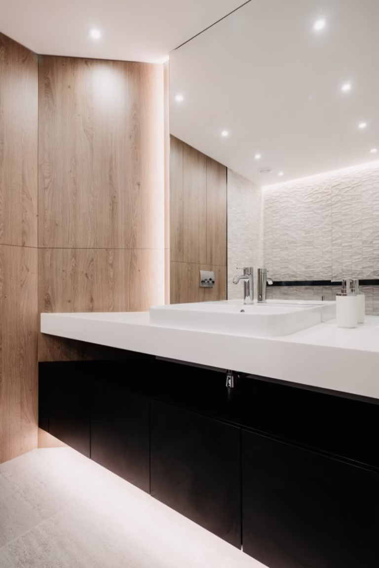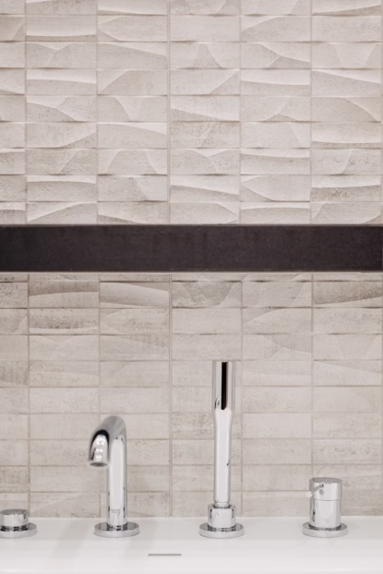 W łazience warto zwrócić uwagę na kafle nad wanną. Chcieliśmy stworzyć wrażenie pokoju kąpielowego, stąd też kafle dobraliśmy tak aby dawały efekt tapety. Ograniczyliśmy też ilość płytek w pozostałych miejscach, zamieniając je na płytę imitującą drewno.