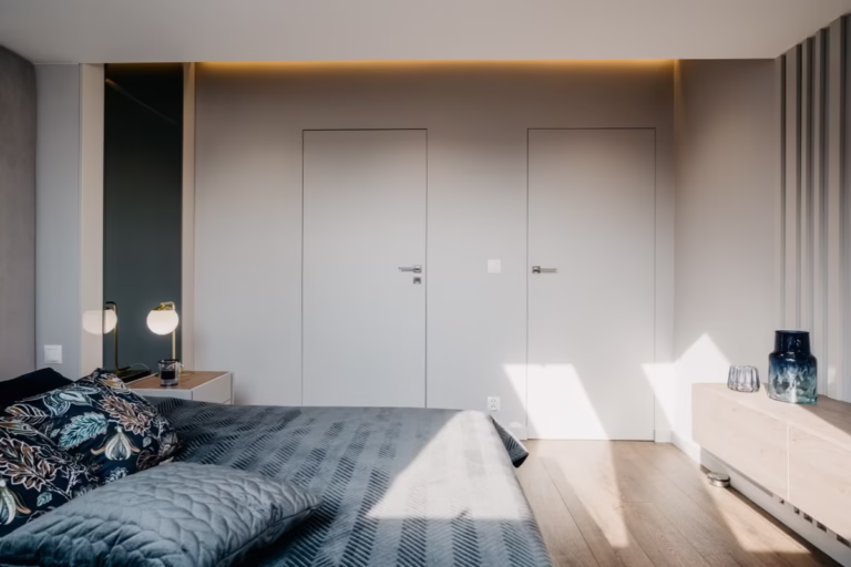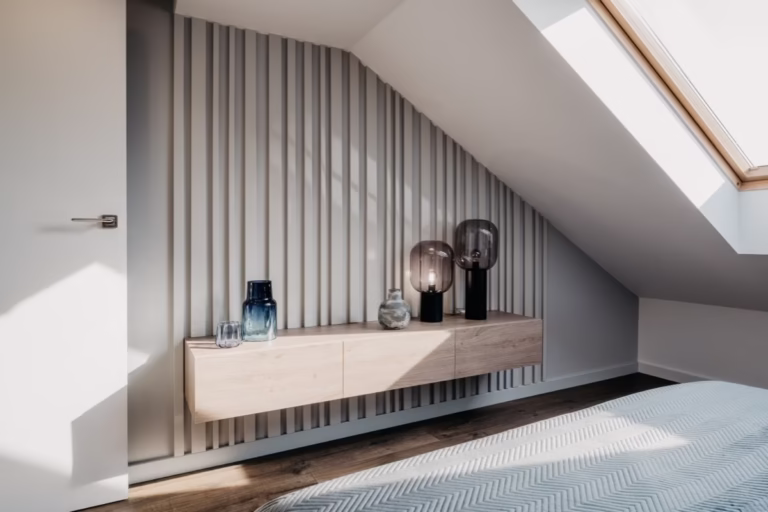 Sypialnia była bardzo trudnym pomieszczeniem. Niska ścianka kolankowa ze skosami prawie na całej szerokości pokoju, powodowały efekt przytłoczenia. Ograliśmy to pionowymi pasami, zarówno w postaci różnej szerokości listew i jak pionowym wezgłowiem łóżka.