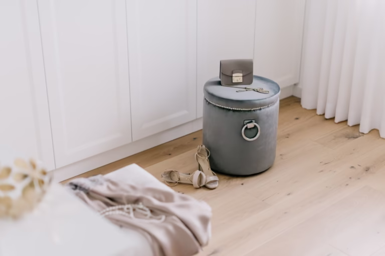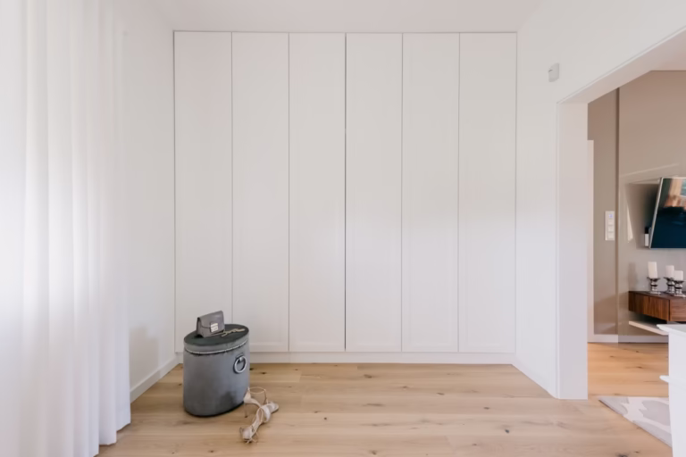 Duża garderoba tuż obok sypialni, która z pań o niej nie marzy? Postawiliśmy tu na brak ograniczeń, stąd brak drzwi między pokojami. Zamknięte szafy i duża przestrzeń, pozwalają na takie rozwiązanie.