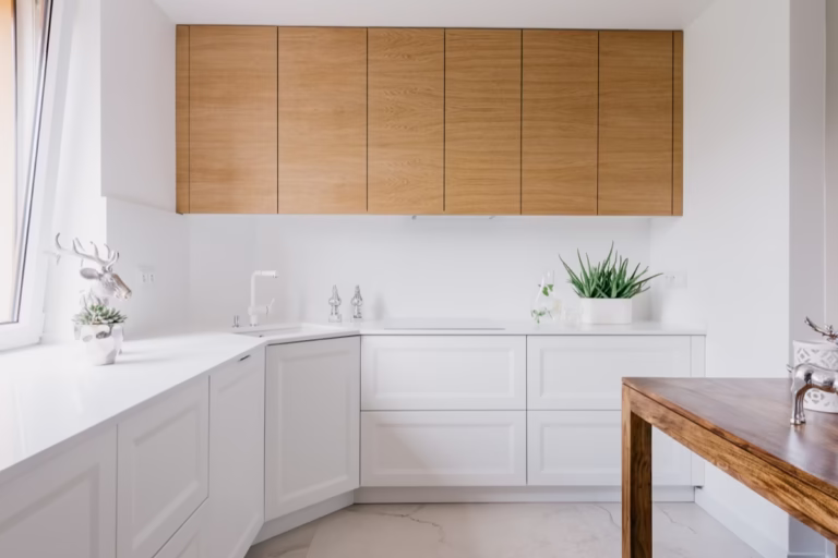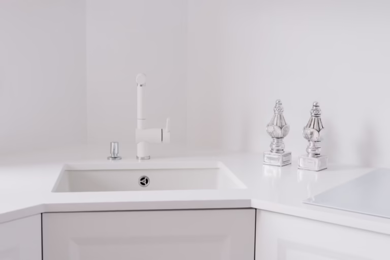 Podwieszany zlew, to powinien być standard w każdym domu. Nie ma to jak sprzątanie „bez przeszkód”, okruszków z blatu. Piękny, śnieżnobiały blat z konglomeratu, pozwolił nam na takie rozwiązanie.