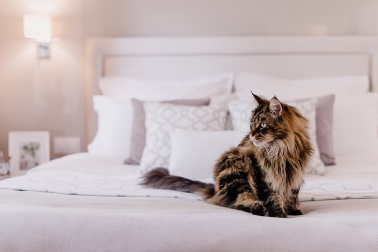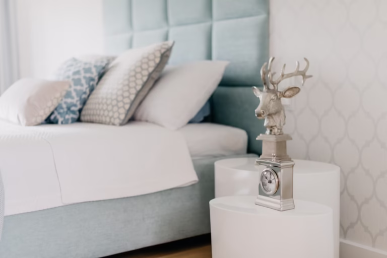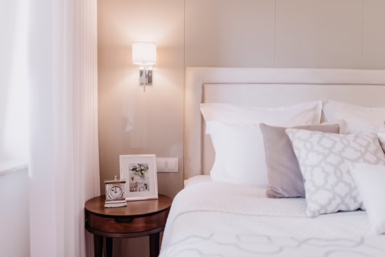 Sypialnia w hotelowym stylu. Wygodne i pięknie ubrane łóżko kontynentalne, blask lamp. Nieprzegadane, eleganckie wnętrze, sprzyjające odpoczynkowi.