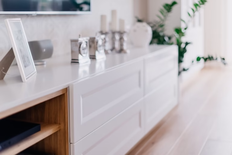 Szafkę RTV dostosowaliśmy gabarytem do wielkość telewizora. Zadbaliśmy też, by spełniła wymagania Klienta, pod kątem przestrzeni na sprzęt audio. Masywną bryłę ubraliśmy w delikatne frezowane fronty i lekką, fornirowaną wnękę na sprzęty.