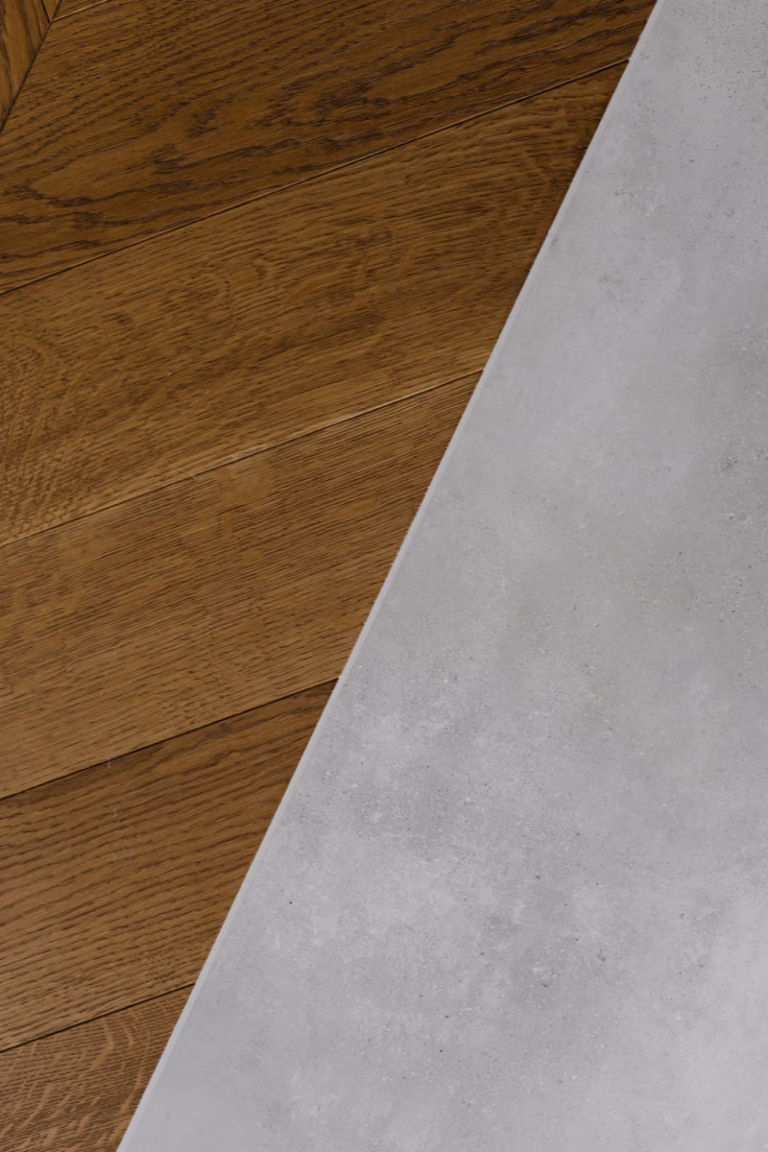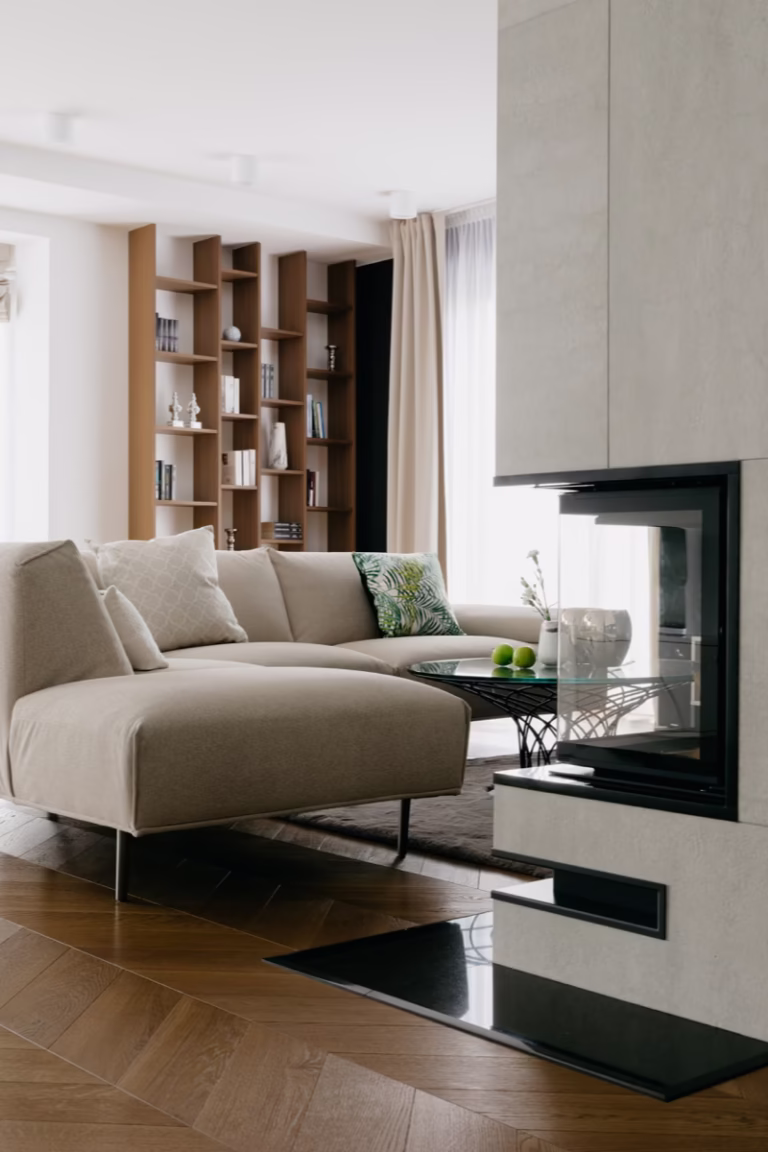 Ważną rolę w całym domu odgrywa też piękna podłoga ułożona w jodełkę francuską. Mimo iż wnętrze jest nowoczesne, jej klasyczna forma idealnie komponuje się z pozostałymi elementami.