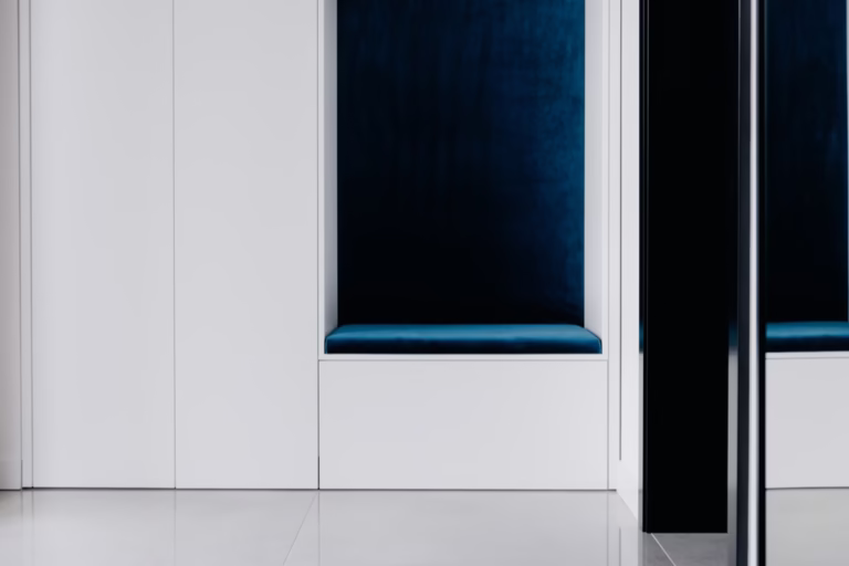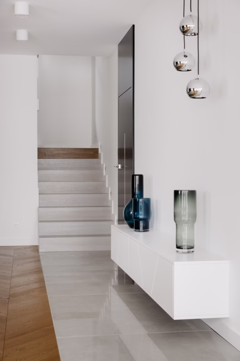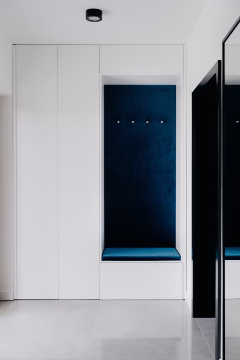 Z dbałości o szczegóły wspólnie z Klientami zdecydowaliśmy się na zastosowanie drzwi z odwrotną przylgą, tak by od strony korytarza wszystkie licowały ze ścianą.