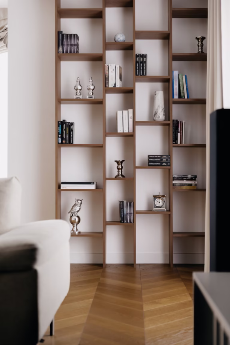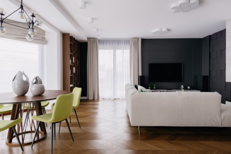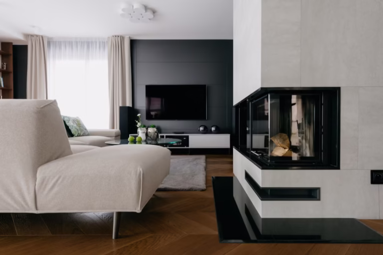 W salonie postawiliśmy na czerń na ścianach. Wykonaliśmy je z czarnej lakierowanej płyty MDF. Znowu pojawiła się prosta forma pionowych i poziomych paneli, tworzących geometryczną całość.