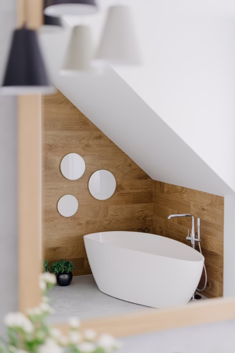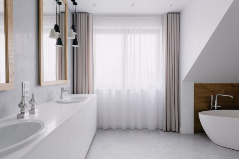 Łazienka to tak naprawę salon kąpielowy. Wyłożona kaflami wielkoformatowymi na podłodze i ze ścianą z umywalkami. Ściany przy prysznicu wykończone są wysokimi na całe pomieszczenie taflami hartowanego szkła.