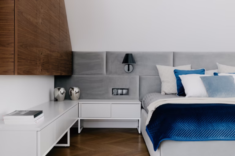Sypialnię wyposażyliśmy w dużą szafę, choć nie było takiej potrzeby ze względu na sąsiadującą z pomieszczeniem garderobę. Ta wypełniła jednak przestrzeń i stała się tłem dla telewizora. Łóżko wykonaliśmy na specjalne zamówienie w Home&Living.