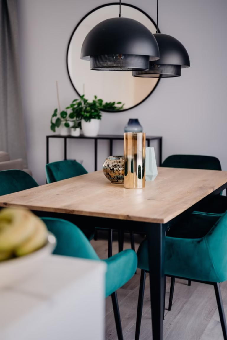 Oprócz zielni położyliśmy również nacisk na detale i różnorodne formy, przykładem może być nakrapiany, kamienny stolik ze wzorem lastryko. Pojawiają się też metalowe lampy, geometryczne formy lustra i ściennych kwietników.