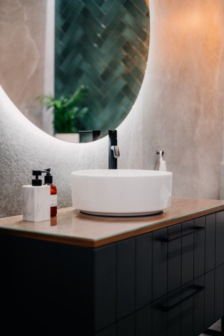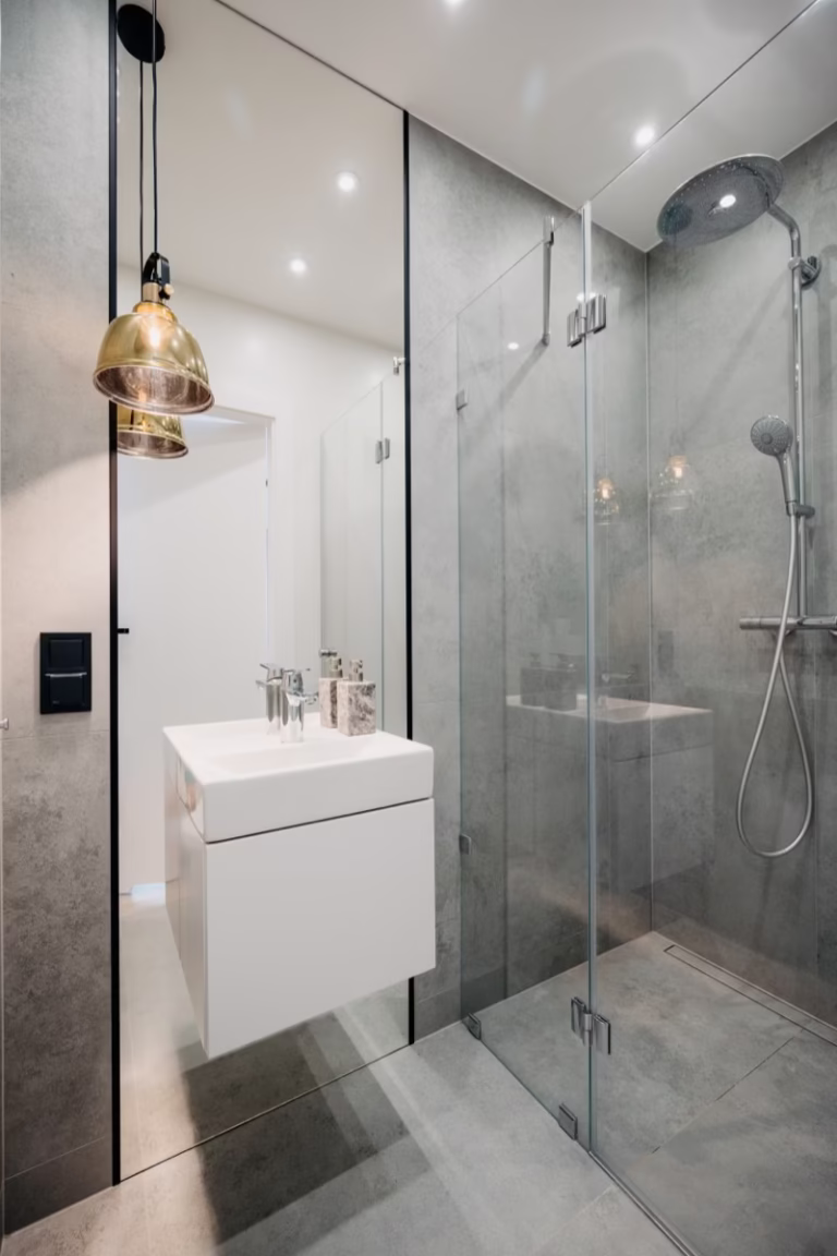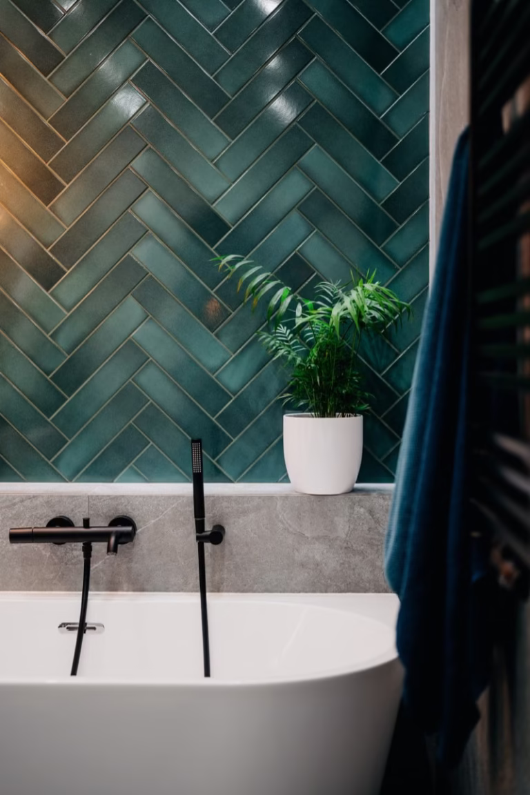 Na koniec łazienka, a w zasadzie pokój kąpielowy. Nieskromnie napiszemy, że wyszedł bosko. Soczysta zieleń kafli pięknie harmonizuje z ciemnoszarymi, kamiennymi kaflami. Możemy się tu poczuć jak na łonie natury.